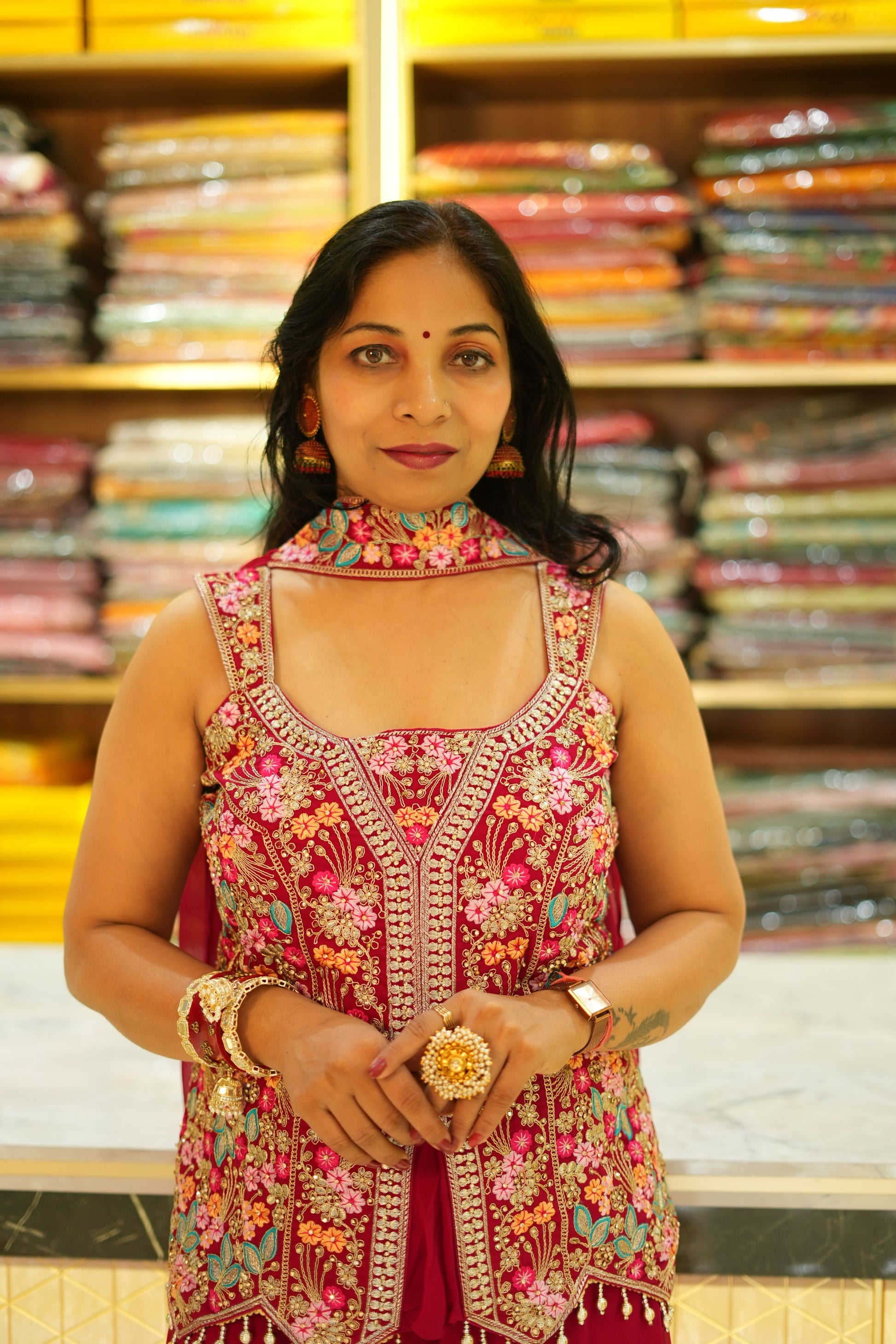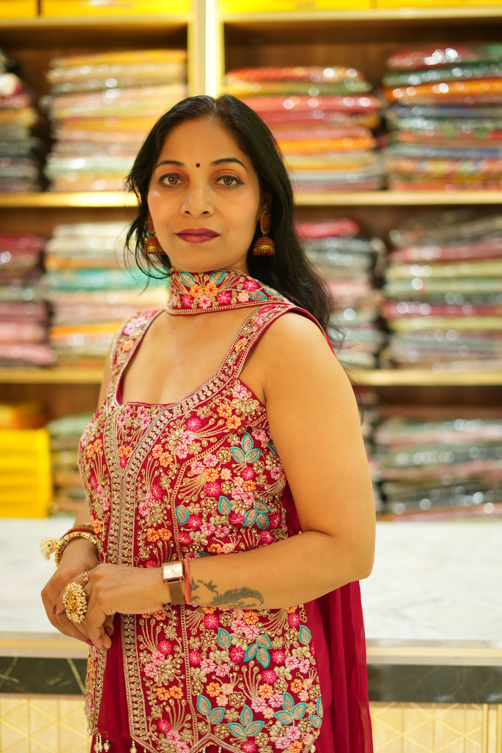 The jacket-style Kurti design combined with mirror, thread, and sequence work, along with a stylish Georgette Sharara and uniquely worked dupatta, makes this outfit truly special. It’s a blend of tradition and trend, ensuring you shine on every occasion.